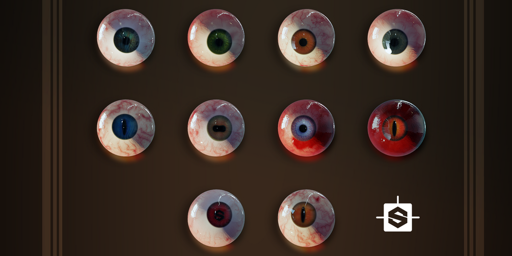 You can customize the color of the sclera, the amount, shape and color of veins, the size and shape of the pupil, color and texture of the iris. 3 variations of pupil shapes are included, with 4th being an input for a custom alpha texture.